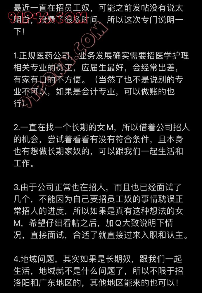 3.由于公司正常也在招人,而且也已经面试了几个,不能因为自己要招员工奴的事情耽误正常招人的进度,所以如果是真有这种想法的女M,希望仔细看帖之后,加Q大致说明下情况,直接面试,合适了就直接过来入职和认主。